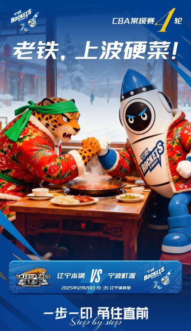 宁波男篮此番客战沈阳,挑战辽宁男篮,12月19日上午,他们发布了海报,海报中,一句响亮的口号,真是叫板辽宁男篮了:老铁,上波硬菜!