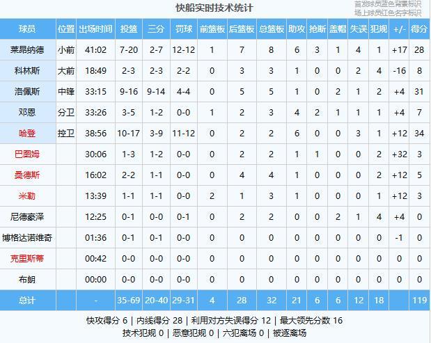 洛佩斯19分1助、哈登14分1板2助、科林斯8分3板1助、莱昂纳德7分2板4助、桑德斯3分1板1助、巴图姆3分、邓恩2分2板3助