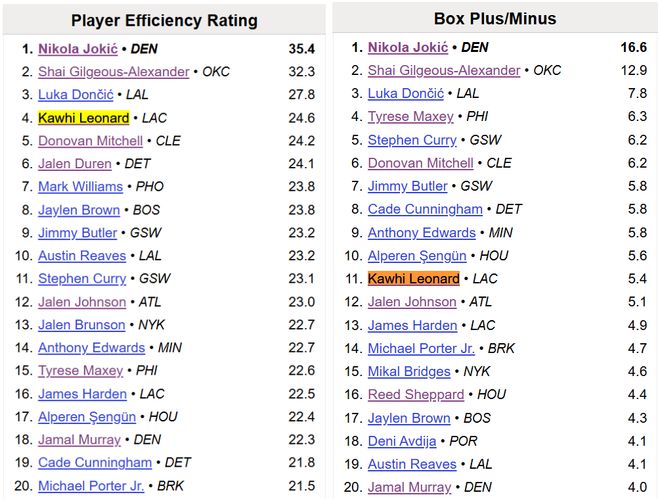 高阶数据上,伦纳德本赛季的PER值达到了24.6,这一数字暂时排在联盟第四,仅次于约基奇、亚历山大、东契奇三位大佬。他的BPM是+5.4,可以排在联盟第11。