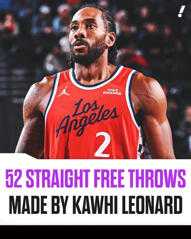 注意,伦纳德已经连续命中了52记罚球,赛季至今的罚球一共109投107中,98.2%的命中率暂时排在历史第一位,此前的历史第一是卡尔德隆在2008-09赛季创下的98.1%(一共154投151中)。