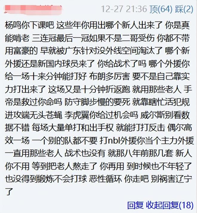 对于杨鸣这样的发言,辽宁球迷却并不买账,毕竟从开季到现在,辽宁还真没练出过什么新人,张陈治锋、王岚嵚、姜宇星前几场打的不错,但最近又被打回原形了,于是赛后有愤怒的辽宁球迷直接喊话杨鸣:下课吧,这些年你用出哪个新人出来了?你是真能啃老。