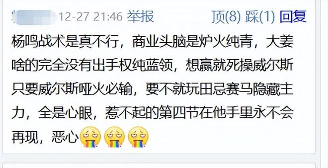 还有球迷表示:杨鸣战术是真不行,商业头脑是炉火纯青,大姜啥的完全没有出手权纯蓝领,只要威尔斯哑火必输,惹不起的第四节在他手里永不会再现。