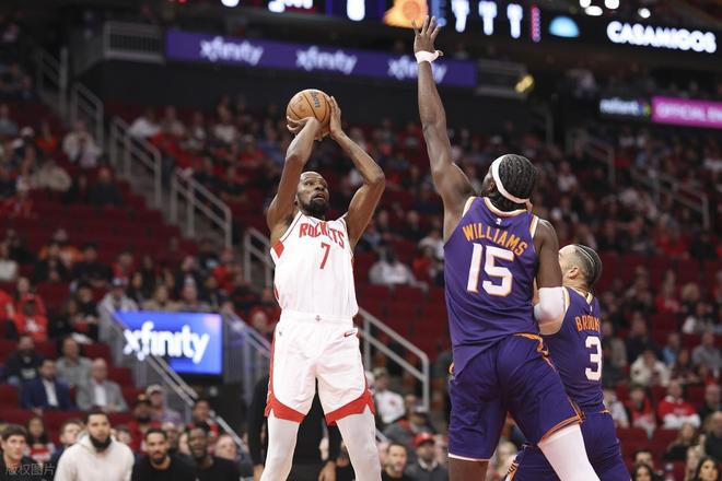 37岁的年龄,对于绝大多数NBA球员而言已是生涯末期,但杜兰特却依旧保持着巅峰级别的得分能力,成为火箭阵中最可靠的“救命稻草”。本赛季他场均贡献26.8分,得分效率丝毫不减当年,生涯总得分成功突破31000分,稳居NBA历史得分榜前列,成为现役球员中最接近历史前五的巨星之一。作为联盟最顶级的得分手,杜兰特的进攻手段依旧无解,干拔跳投、突破终结、外线三分样样精通,即便面对双人包夹,也能凭借极致的身高臂展和手感完成得分。