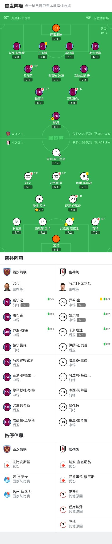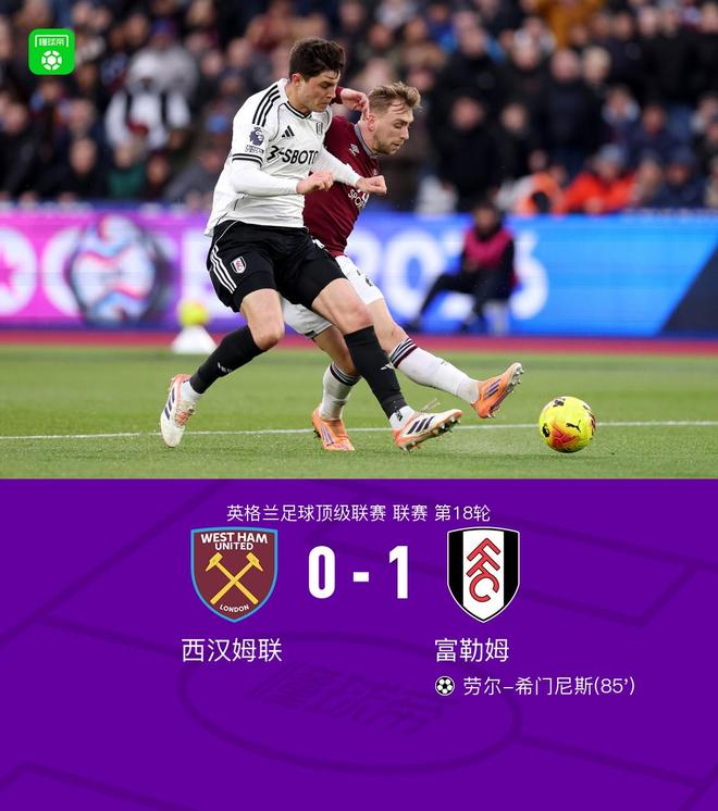 西汉姆联0-1富勒姆,劳尔-希门尼斯绝杀,斯卡莱斯解围失误送礼
