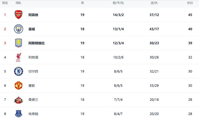 在积分榜上,阿森纳总积分达到45分,排名第1。曼城以40分排名第2,落后了5分。不过,曼城少赛一场。阿斯顿维拉依然是39分,排名第3,争冠形势恶化了。利物浦以32分排名第4。第5的是切尔西,拿到30分。曼联也是30分,排名第6。桑德兰和埃弗顿都是28分。纽卡斯尔联只拿到26分,排名第10。热刺只有25分,排名第13。