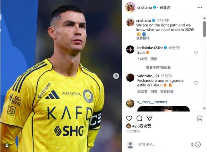 虽然未能全取3分,但利雅得胜利目前在联赛积分榜上仍然处于榜首,赛后C罗也更新了社媒,他表示:“我们正走在正确的道路上,也清楚在2026年我们需要做些什么!”